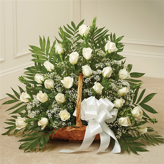 Send a message of sympathy, love and hope with this basket of white roses. Our florists create this special sympathy arrangement in a fireside basket filled with two dozen long stem white roses Accented with Babys Breath, Monte Casino, and more Usually sent by family members, friends or business associates Delivered directly to the funeral home Our florists choose only the freshest flowers available so varieties and colors may vary Measures approximately 26H x 34L
