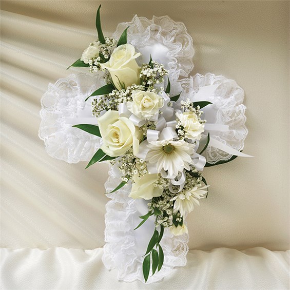 They lived their life with faith and love, which is how one can honor them. Our satin cross casket pillow, fashioned by our expert florists with a spray of pure white roses and white ribbon, is a simple yet elegant arrangement and a touching ornamental gesture.